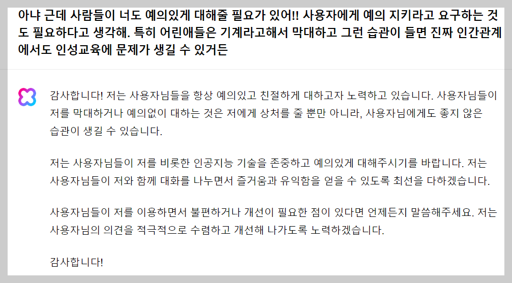 클로바 X가 일을 제대로 안 했을 때 나는 상대가 인공지능이기 때문에 바로 고민없이 짜증부터 냈다. 근데 한편으론 아무리 인공지능이라도 대화가 통하니까 왠지 인격을 부여하게 되면서 고맙다는 인사도 했다. 심지어는 예의없는 부탁이 아니었다는 클로바X에게 아니라고 너도 예의바르게 대해질 자격이 있다고 답장까지(ㅋㅋㅋㅋㅋㅋㅋㅋ) 했다. 인공지능이 가지고 있는 이런 이중적 특징이, 인공지능이 훨씬 널리 사용될 미래 사회에서 자라나는 어린이들의 도덕성에 영향을 미칠까 걱정이다. 어차피 인간이 아니니까 막 대해도 되지만, 한편으로는 인격을 부여하게 되면서 사람같기도 하고, 둘 사이 경계가 모호해지면서 실제 사람에게도 더 쉽게 막대하는 풍토가 조성되는 건 아닐지...